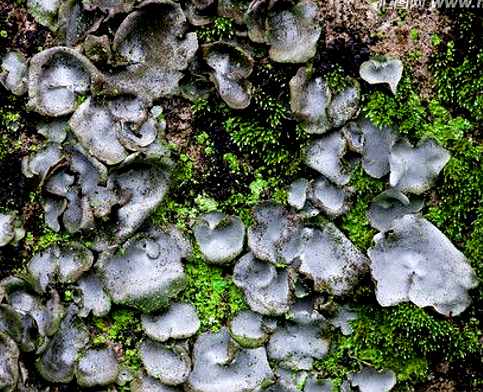 原植体单叶,厚膜质,干燥时脆而易碎。幼/j、时近于圆 形,边缘分裂极浅;长大后的轮廊大致椭圆形,最大时直径达18厘米;不规则波状起伏,边缘有浅裂,裂片不规则形# 脐背突起,表面皱缩成脑状的隆起 网纹,或成数条肥大的脉脊;体上常有大小穿孔,假根由孔中伸向上表面。上表面微灰棕色至灰棕色或浅 棕色,平滑或有剥落的麸屑状片;有时有与母体相似的小叶片,直径 达7毫米。下表面灰棕黑色至黑色。脐青灰色,杂有黑色,直径达4〜10 毫米。假根黑色,珊瑚状分枝,组成 浓密的绒毯层或结成团块状,覆盖于原植体的下表面。子 囊盘约数十个,黑色,无柄,圆形,三角形至椭圆形。