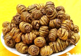 ④耳环石斛:又名:枫斗。为石斛属多种植物的茎经特殊加工制成。㈠西枫斗,干燥茎扭曲呈螺旋形或弹簧形;一般可见有1~4个旋纹,长约1~1.5厦米,直径约3毫米,一端可见茎基及残留的短须根,称龙头,另一端为茎的尖端,称"凤尾",表面黄绿色,有细纵纹理,节明显或有时不明显。气无;味淡。以条粗肥、旋纹少、有头吊、富粉质者为佳。又以所用原料不同又可分为铁皮枫斗(铁皮石斛制成)、铜皮枫斗(细茎石斛制成)、云南枫斗(小美石斛制成)等。㈡圆枫斗,用铁皮、细茎、小美等石斛长于8厘米的茎而不适宜加工成西枫斗者,将其剪成5厘米左右的长度,在微火上烘干,同时扭卷成圆形,如钟表发条状。㈢结子斗,用铁皮石斛的茎节剪断,烘干时打成纽结状。商品枫斗还有直条枫斗、葫芦斗、生川斗、广霍斗等等规格名称。
