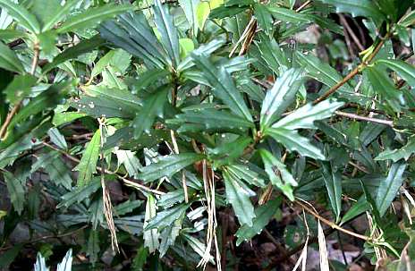 常绿小灌木,高达25厘迷,攀附石上或树上。叶对生或 3叶轮生;革质,长椭圆状披知形,长2.5〜5厘米,宽0.8〜 1.2厘米,先端钝形或尖,边缘具钝状稀锯齿基部楔形或 钝圆,主脉下面凸出;叶柄紫红绿色。聚伞花序腋生及顶 生,花梗长约1厘米;萼深5裂,裂片狭披针形;花冠筒状,白色至淡红色,长约5 厘米,中部以上膨胀,2 唇形,5裂;发育雄蕊2,退化雄蕊2;雌蕊1,子 房上位。蒴果线形,长 约7〜10厘米,直径3 _米。种子细微,纺锤 形,褐色,两端有褐色毛。花期8月。