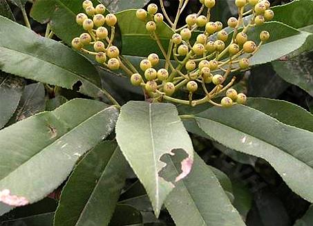 常绿灌木或小乔 木,高达12米。树冠圆 形,多分枝。叶互生,叶片革质,长椭圆形 或长倒卵形,长8〜16 厘米,宽3〜6厘米,先端急尖或渐尖,基 部阔楔形或圆形,边 缘有细密而尖锐的锯 齿,上面深绿色,有光 泽,下面黄绿色,主 咏突起,两面常被有 白粉;叶柄长2〜3 厘米。.顶生圆锥状伞 垮花序,直径10〜18 厘米;花萼钟状,裂片 5,三角形;花瓣5,广 卵圆形,白色;雄蕊多 数,花丝长短不一;子 房半下位,花柱通常 2枚,基部合生。梨果红色,近球形,直径约5毫米。花期 4〜5月。果期10月。