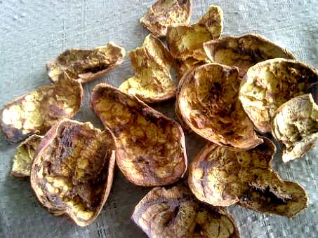 【药材】干燥的果皮呈不规则形 或半圆形的碎片状,厚2〜3毫米。