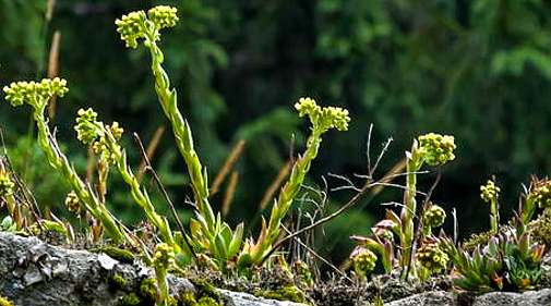 多年生草本。茎丛生,肉质,高11〜13厘米,绿色微带紫色,光滑无毛。叶互生;基部叶倒卵形;茎上叶线状披针形,长约2厘米,肉质,全缘。聚伞花 序顶生,有小花多数;花瓣5 枚,分离,披针形,黄色,有紫色 斑点;雄蕊10,与花瓣约等长;雌蕊6,腹部膨胀。生岩石上。