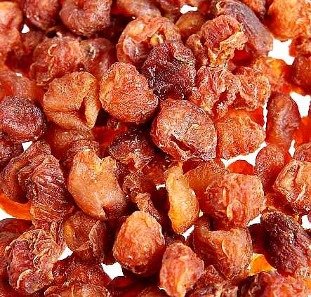 【药材】生?为由顶端纵向裂开的不规则块片,长约1 厘米,宽1.5〜3.5厘米,厚不及1毫米。表面黄掠色,半透 明;靠近果皮的一面皱缩不平,粗糙;靠近种皮的一面光亮 而有纵皱纹。质柔韧而微有粘性,常粘结呈块状。气香,味浓甜而特殊。以片大、肉厚、质细软、色棕黄、半透明、味浓甜者为佳。