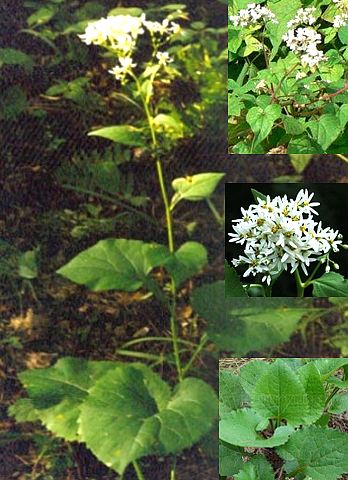 多年生草本,高1〜1.5米。茎直立,圆形,基部光滑,上 部渐有毛,嫩枝顶端毛较密,有时茎的中部略带红色。叶互生;基部叶心脏形,长9〜24厘米,宽6〜18厘米,痄端尖, 边缘具锯齿或复锯齿,上面绿色,下面灰白色,两面有短毛;叶柄长6〜16厘米,具 窄?,花后雕落;签上部 叶卵状三角形,先端尖 锐,基部心形或截形,柄较短。头状花序集成疏 松的伞房状;总苞半圆形,苞片数列,长椭圆形,先端钝,背面绿色, 边缘膜质;边缘为舌状花,白色,雌性,舌片长 10〜13奄米,宽2〜3毫 米,管长约3奄米;中央管状花,黄色,两性,花 冠长约5.5毫米。瘦果长椭圆形,长3〜3.5奄 米;冠毛棕黄色,长短不等。花期秋季。