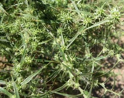 一年生草本,高20〜50厘米。茎由基部分歧,枝斜上,多曲折,坚硬,具条纹状角棱,幼时密 被散射状分枝的毛,后渐光滑,草绿色。叶互生;无柄;披针形至线形,长2〜7厘米,宽1〜7毫米,基部渐狭,先端具刺尖,全缘,具散射状分枝毛,叶脉凸出,平行。叶状苞卵形,先端渐尖,具刺尖;花两性,花穗无柄腋生,无花 被;雄蕊3,花丝锥形,膜质,花药卵圆形;子房具2柱头。胞果圆形或椭圆形,两面均平,或背面稍凸,具膜质翅,先端二叉分歧。种子扁平,直立,圆形,胚乳粉质, 胚环形。花期8月。果期9〜10月。