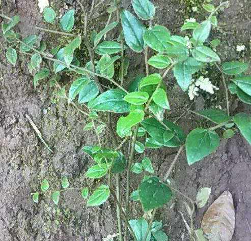 多年生草本,高约60厘米。根茎粗短,密生纤维状须根。 茎斜向上平展,黄绿色,被棕色绒毛。单叶互生;卵圆形或长卵圆形,长3〜6厘米,宽1.5〜2厘米,先端尖,全缘,基 部浅心形,上面沿脉上及边缘有棕色绒毛,下面密被白绒 毛,但沿脉上及边缘有棕色绒毛,主脉3条。头状花序几个 排成腋生短总状花序;花白色,长约2厘米;花轴自叶腋扭 向叶背面,悬垂于叶下。瘦果有冠毛。花期秋季。