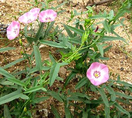 多年生缠绕草本。叶互生,卵状长圆形或三角状卵形,长 不到宽的2倍,先端微圆,基部近戟形或箭形,全缘或微波 状。花1〜2朵生于叶腋,花梗细长;苞片2,线形;花冠淡红色,漏斗状,有不明显的 裂片5。蒴果球形。花期 6〜8月。