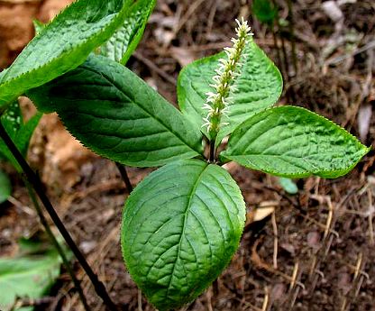 多年生草本,高可达 50厘米。主根祖短,须 根发达,多而粗,长10〜14厘米,直径约3毫米,近先端分枝。菩直?,光 滑无毛,具4〜6个节。单叶轮生于茎端,通常 4枚,叶片倒广卵形或 长卵圆形,长10〜17厘 米,宽约8厘米,先端渐 尖,钝头,边缘具圆齿,齿端芒尖,基部渐狭,呈 阔楔形,两面光滑,背面叶脉 裣有白色柔毛;无柄或近于 无柄。穗状花序通常2枝,直出枝顶,长12厘米,花两 性及单性,小形,白色,花径 约2〜3毫米;雄花无花被,雄蕊3,倒卵圆形,合生成1 片状体,3裂。核果,卵球形 或球形,先端具尖状突起,外 果皮肉质,果长约2.5毫米,宽约2毫米。花期4月。