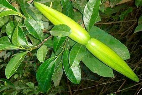 攀援状大藤本。茎浅 棕色,皮部有许多突起 物,幼枝光滑,老枝有纵 绉纹,茎与根有香气。单 叶对生;长椭圆形,长 4~10厘米,宽2~4厘 米,先端渐尖,基部楔 形,全缘,上面绿色,下 面淡绿,叶脉赤红色,无 毛。聚伞花序腋生;花 小,黄白色。大?荚果, 木质,长椭圆形,呈平行 展开,长5~9厘米,先 端有弯钩。种子多数,有 长的白色绢毛。
