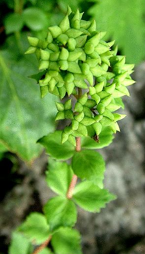 多年生草本,全体无毛。根茎肉质,褐色。茎直立而长,分枝少。花茎直立,高约30〜35厘米。叶 3片轮生,无柄,卵状菱形,长 1.5〜3.5厘米,先端急尖,基部宽楔形,边?具不整齐的钝牙齿或波状。花序聚伞状,具多数花;雌雄异株;萼片4,条状披针形;花瓣4,黄绿色,矩圆状披针形,长2亳米;雄蕊较花瓣为短;雌花 心皮4,直立。?荚果上部叉开,呈星芒状。种子狭卵形或长圆形,褐色。花期5〜6月。果期7〜8月。