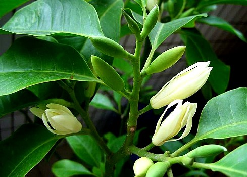 常绿乔木,高达10〜20米(江、浙等地天气较寒,常呈灌 木状,高仅1〜2米);树皮灰色,幼枝和芽被白色柔毛。叶薄革质,互生,卵状椭圆形或长圆形,长10〜25厘米,宽4〜9厘米,两端均渐 狭,两面无毛或于下面被疏毛,小脉网状;叶柄长 1.5〜2厘米,上有短的托叶痕迹,约为柄全长的1/3 或1/4。花白色,单花腋生,极香,长3〜4厘米;萼片长圆形;花瓣线状,长 3.2厘米;雄蕊多数,多列,花丝扁平;心皮多数,胚珠在每心皮内多于2,螺旋状排列于延长有柄的花托上,子房被毛,柱头头状。果近球形,由多数?裂的心皮组成,多不结实。花期7月。