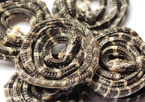 ②银环蛇:于夏季捕捉幼蛇,剖腹除去内脏,盘成圆形,用竹签撑开后焙干。商品称为"金钱白花蛇"。