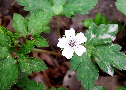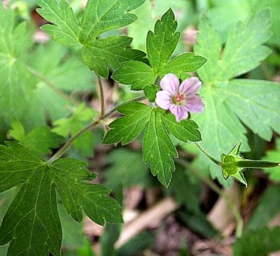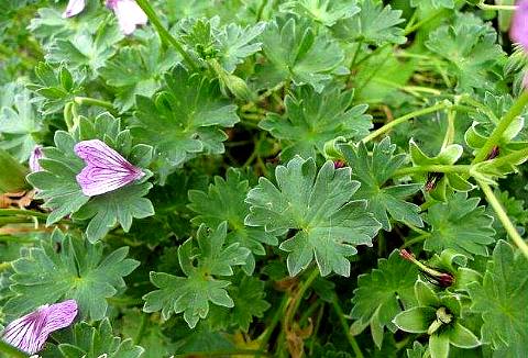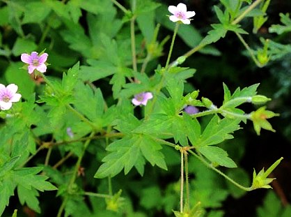 ③尼泊尔老鹳草: 多年生草本,形态与上种相近,但植物较矮小,高30~45厘米,逆生平伏毛。叶3~5深裂,裂片小,卵状披针形或狭卵形,先端钝尖,缘具不整齐粗齿。花径约1厘米,白色、淡红色或紫色。花期6月。果期7月。