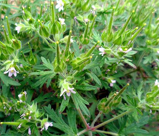 ②老鹳草: 多年生草本,高35~80厘米。茎伏卧或略倾斜,多分枝。叶对生,叶柄长1.5~4厘米,具平伏卷曲的柔毛,叶片3~5深裂,近五角形,基部略呈心形,裂片近菱形,先端钝或突尖,边缘具整齐的锯齿,上面绿色,具伏毛,下面淡绿色,沿叶脉被柔毛。花小,径约1厘米,每1花梗2朵,腋生,花梗细长;花萼5,卵形或卵状披针形,疏生长柔毛,先端有芒;花瓣5,倒卵形,白色或淡红色,具深红色纵脉;雄蕊10,全具花药:花柱5裂,延长并与果柄连合成喙。蒴果先端长喙状,成熟时裂开,喙部由下而上卷曲。种子长圆形,黑褐色。花期5~6月。果期6~7月。