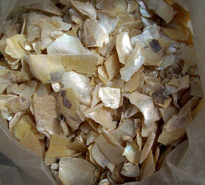 【药材】为不规则的片状,大小不一,厚约5毫米。一面浅粉红色,有彩色光泽,一面乳白色,平滑,有光泽;表面有白粉。质松脆,可层层剥离。气无,味淡。以片大、色白、酥松而不碎者为佳。