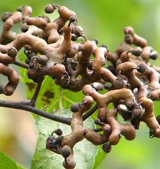 【药材】①干燥带果柄的果实:果柄膨大,肉质肥厚,多分枝,弯曲不直,形似鸡爪,在分枝及弯曲处常更膨大如关节状,分枝多呈丁字形或相互成垂直状,长3~5厘米或更长,直径4~6毫米。表面棕褐色,略具光泽,有纵皱纹,偶见灰白色的点状皮孔。分枝的先端,着生1枚钝三棱状圆球形的果实,果皮纸质,甚薄,3室,每室含种子1粒。果柄质稍松脆,易折断,折断面略平坦,角质样,淡红棕色至红棕色。气微弱,味淡或稍甜。