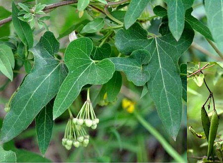 多年生缠绕草本,高速1~2米。茎纤细,表面淡灰紫色,无毛。单叶对生;叶柄纤细,稀生细柔毛;叶片戟形或三角状心形,长3~5.5厘米,宽1~2厘米,先端渐尖,基部心形,全缘,上面深绿,稀被短硬毛,主脉的基处有棕色短腺毛2~4枚,下面淡绿色,脉上有细柔毛。伞形花序腋生;花小,黄绿色,花萼近于5全裂,裂片卵形,向下反折;花冠5深裂,裂片披针形,向下反折;副冠5,和雄蕊连生在基部,呈披针状而展开,并高出于柱头之上;雄蕊5,花丝相连作管状,包围雌蕊,花药着生在柱头周围;雌蕊1,由2分离心皮组成,花柱2,顶部连合成一肥厚盘状5裂柱头。??果2,长角状,长约10厘米,成熟时沿一侧开裂。种子倒卵形,先端有银白色细绒毛,长约3厘米。花期6~7月。果期8~9月。