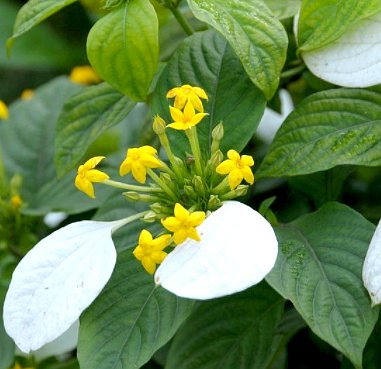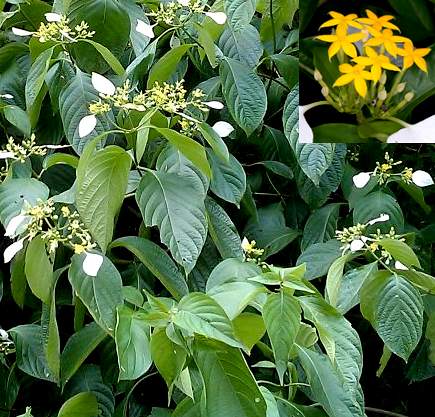 ②展枝玉叶金花:落叶小灌木,高约1米左右。根深棕色,有恶臭。茎灰白色,皮孔椭圆形,棕色,大小不一,稍微突起,幼枝有毛。单叶对生,少数轮生;长椭圆形,长约7.5~11厘米,宽约4~5厘米,先端急尖,全缘,羽状脉,侧脉6~8对,不直达边缘而向前弯斜,两侧脉间部分向上面隆起,因此全叶呈高低不平的形状,上面深绿色光滑,下面绿白色,有短毛;顶部嫩叶的基部带紫色;叶柄长约1厘米。复聚伞花序顶生,花黄色,萼片5裂;花冠漏斗状,筒部长,外被绢丝状毛,喉部亦有毛,上部较阔,裂片5扩展,卵圆形,先端尖,在芽内为镊合状;雄蕊5;子房下位,2室,柱头2,线形。浆果。种子多数,小而有棱角。花期夏季。