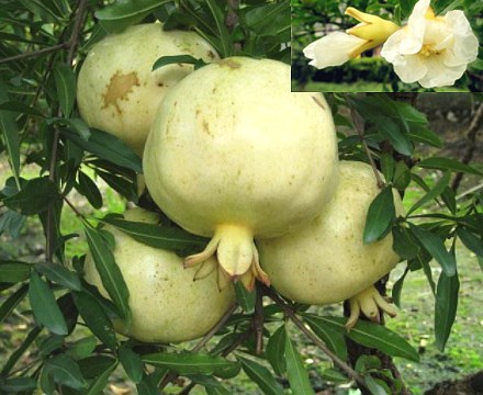 【原形态】①白石榴:落叶灌木或小乔木,高约6米。小枝圆形或有微棱,枝端呈刺状,光滑无毛。叶对生或簇生于短枝,具短叶柄;叶片矩圆形、倒卵形至长圆形,长2~3厘米,宽约1.5厘米,先端钝,无毛,有光泽。花白色,径约3厘米。浆果近球形,径约10厘米,褐黄色至红色,内具薄隔膜。种子多数,包藏于红色或淡红色的果囊内。花期5~6月。
