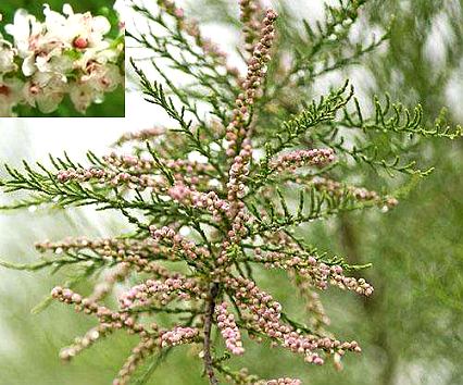 ③多枝柽柳:灌木或小乔木,高3~5米。小枝纤细,无毛,有浅条沟,紫色或紫褐色。叶互生,为卵形至披针形的细小鳞片,覆瓦状,基部抱茎或半抱茎,先端渐尖,全缘,灰绿色或带白粉。单总状花序较稀疏地生长于当年幼枝上,长3~8厘米,再集成顶生圆锥花序;苞片卵状披针形;花小,淡粉红色。花期夏、秋季。