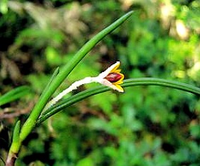多年生附生草本,高约20厘米。根茎横走,有节,节下具丛生的黄褐色细须根。叶密集基出,扁圆线形,肥厚,肉质,中空,多汁,深绿色,先端钝尖,叶长15~20厘米,宽0.5~0.8厘米,厚0.3厘米;叶基部有鞘抱茎。总状花序长约5厘米,顶生或生于叶腋之间,有1~4朵花;花小,长12毫米,橙黄色。蒴果小,具棱,内有多数种子。花期夏季。