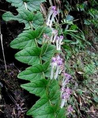 直立草本。茎四方形,紫色,高25~35厘米。叶对生;三角状卵形,基生叶肾形,长0.7~2.3厘米,宽0.8~1.6厘米,先端钝,基部心脏形,边缘具波状锯齿,两面均光滑无毛,上面深绿色,下面灰绿色;几无柄。花生于叶腋;花萼钟状,2唇形,唇短而阔,全缘,花后封闭,上唇的背部有扩大的鳞片,果时脱落;花冠管长而突出,白色,近萼处紫色;雄蕊4,花药有毛;雌蕊1,子房4深裂,花柱基底着生。小坚果近球形,平压状,略被毛。花期7月。