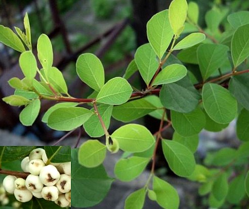 落叶灌木,高1~3米。茎红褐色,老枝具粗短刺。叶互生,矩圆状倒卵形至椭圆形,长1.5~5厘米,宽1.2~2.2厘米,纸质,先端稍钝形,有小突尖,全缘,叶基广楔形,上面绿色.下面浅绿带苍白色;叶柄长3~5毫米;托叶2片,长1.5~2毫米。花细小,淡黄色,单性,雌雄异株,多朵簇生于叶腋;萼片5,宿存,直径约2毫米,无花瓣;雄花雄蕊5,露出萼外而与花盘的小腺体互生,花丝浅黄色,花药圆形;雌花花盘环状,子房3室,花柱3,很短,柱头2裂。果实球形,肉质,成熟时白色,径3~4毫米。种子细小,扁圆形,浅黄色。花朋6~7月。果期10~11月。