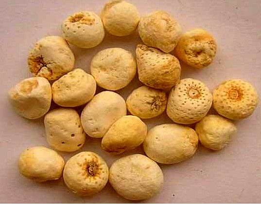 【药材】干燥块茎呈圆球形、半圆球形或偏斜状,直径0.8~2厘米。表面白色,或浅黄色,未去净的外皮呈黄色斑点。上端多圆平,中心有凹陷的黄棕色的茎痕,周围密布棕色凹点状须根痕,下面钝圆而光滑。质坚实,致密。纵切面呈肾脏形,洁白,粉性充足;质老或干燥过程不适宜者呈灰白色或显黄色纹。粉末嗅之呛鼻,味辛辣,嚼之发粘,麻舌而刺喉。以个大、皮净、色白、质坚实、粉性足者为佳。以个小、去皮不净、色黄白、粉性小者为次。