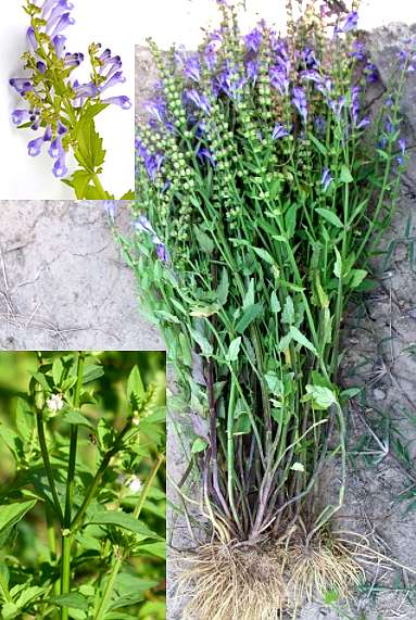 多年生草本。根须状。茎直立,四棱形,高15~50厘米。叶对生;卵形至披针形,长约7~32毫米,宽4~15毫米,基部截形或心脏形,先端钝形,边缘具疏锯齿;茎下部的叶有短柄,顶端的叶近于无柄。花轮有花2朵并生,集成顶生和腋生的偏侧总状花序;苞片披针形,上面及边缘有毛,背面无毛;花柄长1~15毫米,密被粘液性的短柔毛;花萼钟形,顶端2唇裂,在花萼管一边的背部常附有盾片;花冠浅蓝紫色,管状,顶端2唇裂,上唇盔状、3裂,两侧裂片齿形,中间裂片圆形,下唇肾形;雄蕊4,2强,不伸出;子房4裂,花柱完全着生在子房底部,顶端2裂。小坚果球形,横生,有弯曲的柄。花期5~6月。果期6~8月。开花时采收,去根,鲜用或晒干。
