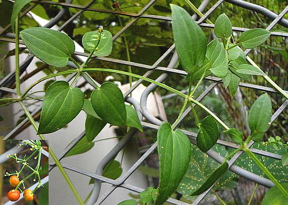 多年生攀援草本,长1~3米。支根数条或数十条,细长,外皮黄赤色。茎方形,有4棱,棱上有倒生刺。叶4片轮生,有长柄,叶片卵状心形或狭卵形,长1.5~6厘米,宽1~4厘米,先端渐尖,基部心脏形或圆形,全缘,叶脉3~5,自基部射出,叶柄和叶下面中肋上均有倒刺,聚伞花序圆锥状,腋生或顶生;花小,花萼不明显;花冠5裂,裂片卵形或卵状披针形,基部联合,淡黄色;雄蕊5,着生于花冠筒喉内,花丝较短;子房下位,2室,花柱上部2裂,柱头头状。浆果小球形,肉质,红色转黑色。花期7~9月。果期9~10月。