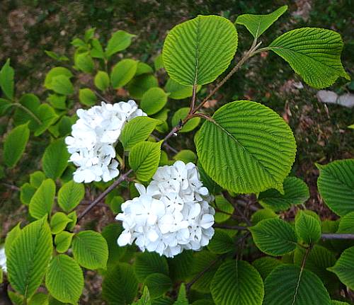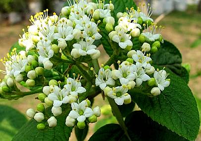 落叶灌木,高达3米。茎直立,褐色,多分枝,冬芽具2外鳞,嫩枝有星状毛。单叶对生,膜质,叶片圆形至广卵形以至倒圆形,长6~8厘米,宽约5厘米,先端突尖至短渐尖,基部圆形至近心脏形,叶缘具三角状锯齿;上面有疏毛,下面有星状毛及黄色鳞片状腺点;叶咏羽状,5~8对,直走叶缘;无托叶。聚伞花序多花,径8~12厘米,有星状毛;萼管短,具5齿,宿存;花冠裂片5,有毛;雄蕊5,长于花冠,药分离,2室;花柱短,柱头尖,3裂;子房下位。浆果状核果,广卵圆形,深红色,无毛。花期5~6月。果期9~10月。