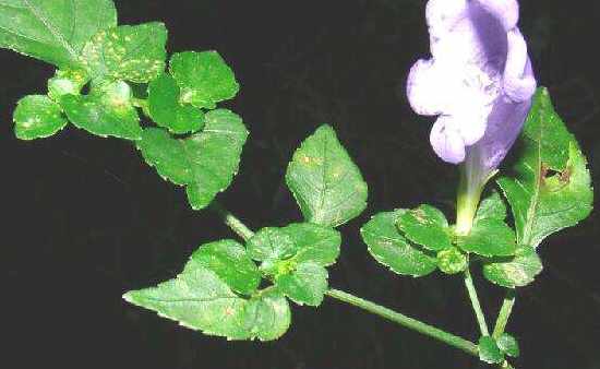 多年生草本,高30~70厘米。茎方形,下部红褐色,被淡褐色细柔毛。叶对生,有长柄;叶片卵状椭圆形,长7~12厘米,宽3~4.5厘米,先端长尖,基部楔形,偏斜,下延,边缘有浅锯齿,上面散生短毛。花序梗腋生,苞片大,卵形;萼5深裂,裂片线形,长1~1.2厘米;花冠紫蓝色,内面有深色斑纹。夏季采收。