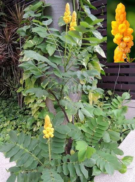 灌木或小乔木。叶近于无柄,长30~60厘米;小叶5~12对,矩圆形,先端钝,长5~15厘米,宽5~7厘米,有细尖,硬革质,基部阔圆形,并在一边偏大,叶轴两边有狭翅。总状花序长15~30厘米,生于茎顶;苞片大,三角形,膜质,早落;花黄色,有很多明显的脉;雄蕊极不相等。荚果长舌状,膜质,开裂,每瓣纵贯中央各有一阔翅,无毛,长10~20厘米,阔12~15毫米。全年可采。多为鲜用。