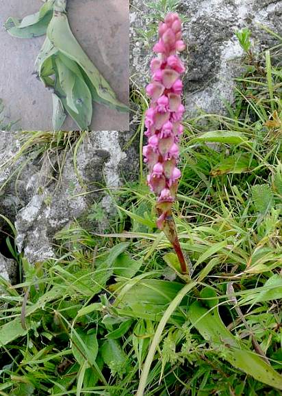 一年生草本,高33~48厘米。根2枚并生,稍肉质;纺锤形,长约1.5厘米。叶2~3枚,披针形至长椭圆形,长12~18厘米,宽4~6厘米,先端长渐尖,基部钝圆魂阔楔形,抱茎,两面均无毛;平行脉10~15条,两面凸出。穗状花序顶生,长9~13厘米,下面有披针形向下反折的苞叶3~5枚,花排列较疏,每花下有反折的卵状披针形苞片1枚;花粉红色,唇瓣直立,盔状。蒴果椭圆形,内有种子多数。秋季采挖,洗净晒干。