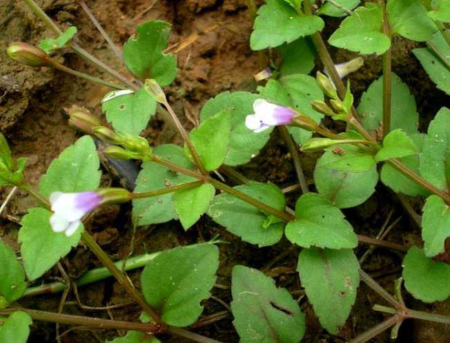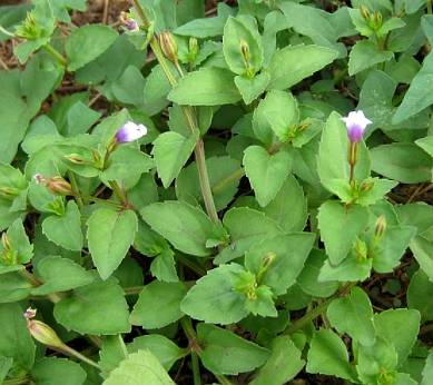 一年生草本,高8~20厘米,披散,多分枝,秃净或稍被疏毛,叶对生,具短柄;叶片卵形,长8~15毫米,先端钝或短尖.基部阔楔形或浑圆,有极疏的锯齿。花腋生,或在上部的为总状花序;花柄长1~3厘米;萼5裂,绿色或淡紫色,膜质,有脉5条,裂片短尖;花冠管圆筒状,长约8毫米,2唇形,上唇2裂,下唇3裂,紫色雄蕊4;子房上位。蒴果长椭圆形或卵形,藏于宿萼内。花期7月。