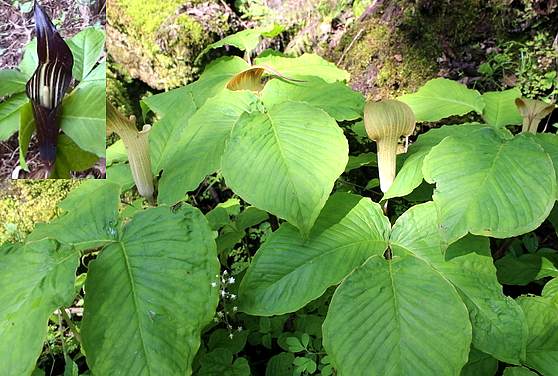 多年生草本。块茎扁球形,有细长须根多条。第一年生1叶,心形,柄长约16厘米,肉质,呈紫色;第二年后均为3出复叶,叶片阔卵形,长8~11厘米,宽2~1厘米,先端细尖,基部心形,全缘,下端偶有不规则裂片,两面无毛,中脉下面突出。肉穗花序;佛焰苞呈阔而短的管,卷曲,先端长尖,有紫白色相间的带状花纹。浆果椭圆形,红色,组成象玉米棒样的密穗。花期夏季。16.04