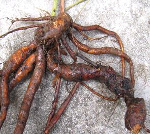 【药材】干燥的根呈不规则的纺锤形或圆柱形,梢弯曲,长约8~13厘米,径约0.5~2厘米。外皮暗紫红色或棕黑色,有纵皱及横向裂纹,顶端有时具环纹。少数有圆柱状根茎,多数仅留痕迹。质坚硬,不易折断,断面粉红色残淡黄色,有排成环状的小白点。气无,味微苦涩。以条粗、质坚。断面粉红色者为佳。