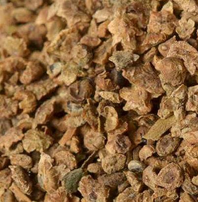 【性状】干燥果实呈扁圆形五角星状,直径1~3毫米,厚约1毫米。外面为宿存花被,膜质,先端5裂,裂片三角形,土灰绿色或浅棕色;有的具三角形小翅5枚,排列如五角星状。顶面中央有柱头残痕,基部有圆点状果柄痕,及10条左右放射状的棱线。花被易剥离,内有1粒小坚果,横生,果皮半透明膜质,有点状花纹,亦易剥离,种子褐棕色,扁平,形似芝麻,在扩大镜下,可见表面有点状花纹,中部稍凹,边缘稍隆起,内有马蹄状的胚,淡黄色,油质,胚乳白色。气微,味微苦。以色灰绿。饱满、无枝叶杂质者为佳。
