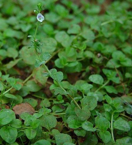 多年生小草本,高6~20厘米。灰白色根茎细长,着生多数须根。茎基部匍匐,分枝,具短柔毛。下部叶对生,上部叶互生;卵形或椭圆形,长6~12毫米,宽4~8毫米,近全缘或有微齿;无柄或有极短柄。总状花序顶生;花近白色,带蓝色条纹,花梗基部有披针形苞片;萼4裂;花冠管极短,肢4裂;雄蕊2;子房上位,2室。蒴果近球形,先端凹陷。