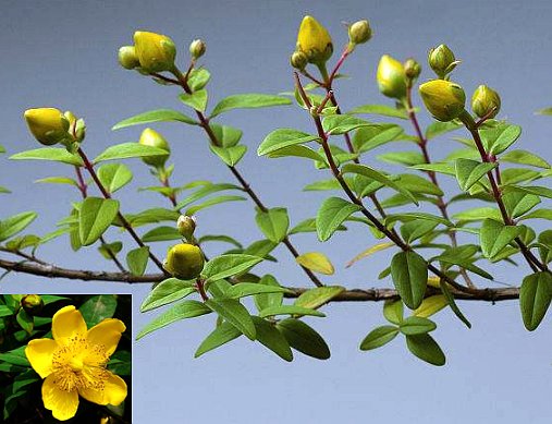 小灌木,高可达1米以上。小枝圆柱形,褐色,节处略膨大。叶对生,近于无柄,叶片卵圆形或矩圆形,长1.9~4厘米,宽1~2.2厘米,先端钝,基部圆形,全缘,纸质,上面绿色,下面粉绿色,有油腺点。花3~7朵,单生或成聚伞花序,着生枝梢;花黄色,直径3.5~5厘米,萼5片,倒卵形,先端微钝;花瓣5片,与萼互生,阔倒卵形;雄蕊多数,长约花瓣之半,花丝黄色,基部合成5束;雌蕊1,子房上位,圆锥形,光滑,花柱5,柱头头状,向外反卷。蒴果,卵形,长8~15毫米,5裂。种子褐色,圆柱形,细小。花期初夏。全年可采。