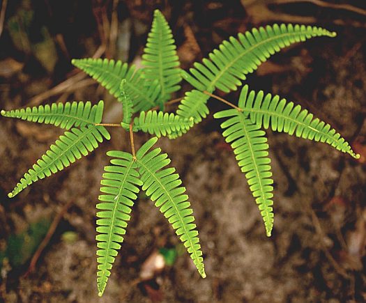 多年生草本,高30~60厘米。根状茎横走,细长,褐棕色,被棕色鳞片及根。叶远生,叶柄褐棕色,无毛;叶片重复假两歧分叉,在每一交叉处均有羽片(托叶)着生,在最后一分叉处有羽片两歧着生;羽片披针形或宽披针形,长20~30厘米,宽4~7厘米,先端渐尖,羽片深裂;裂片长线形,长3.5~5厘米,宽4~6毫米,先端渐尖,钝头,边缘干后稍反卷;叶下白色,与羽轴、裂片轴均被棕色鳞片;细脉2~3次叉分,每组3~4条。孢子囊群着生细脉中段,有孢子囊6~8个。全年可采。