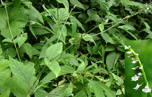 多年生草本,高30~80厘米。茎四棱形,淡紫色,具倒生短毛及紫条纹,节部膨大。单叶对生;卵状长椭圆形,长5~10厘米,宽4~7厘米,先端短尖或渐尖,基部楔形,边缘具钝圆锯齿,两面脉上有短毛;叶柄长0.5~3厘米。穗状花序顶生或腋生,长10~20厘米;苞片及小苞片钻状;花疏生,有短柄;萼筒状,具5棱,长3~6毫米,上唇3齿呈芒状钩,下唇2齿较短,无芒;花冠筒状,粉红色或白色,长约5毫米,裂为唇形,上唇2浅裂,下唇3裂;雄蕊4,2强,着生于花冠筒部;子房上位,1室,花柱顶生,柱头2裂。瘦果包于宿萼内,长8~10毫米。花期6~8月。果期9~10月。17.08