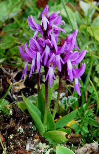 多年生草本。块茎球形;茎直立,单一,高10~15厘米。基生叶2枚,对生;宽披针形或卵状披针形,长3~6厘米,宽1~3厘米;茎生叶细小,呈苞片状。穗状花序通常为一侧生;花淡红紫色;除唇瓣以外的花被片皆互相靠合成为盔瓣状,唇瓣3深裂,裂片线形,距较细,与子房近等长。蒴果。17.45