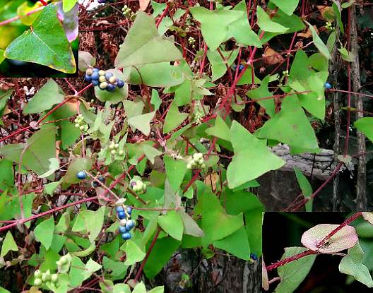 多年生蔓性草本,全体无毛。茎有棱,棱上有倒生钩刺,多分枝,绿色,有时带红色,长1~2米。叶互生,近于三角形,长与宽均为2~5厘米,淡绿色,下面叶脉疏生钩刺,有时叶缘亦散生钩刺;叶柄盾状着生,几与叶片等长,有倒生钩刺;托鞘叶状,圆形或卵形,包茎,直径2~3厘米。短穗状花序,顶生或生于上部叶腋,花小,多数;具苞,每苞含2~4花;花被5裂,白色或淡红紫色,裂片卵形,不甚展开,随果实而增大,变为肉质;雄蕊8;雌蕊1,子房卵圆形,花柱3叉状。瘦果球形,径约3毫米,暗褐色,有光泽,包在蓝色花被内。花期6~8月,果期9~10月。