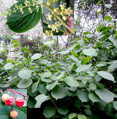 藤状灌木,长5~7米。小枝常有4~6锐棱,红褐色,发亮,密生细小皮孔。叶互生,宽卵形或近圆形,长8~16厘米,宽7~15厘米,先端短尖,边缘具不规则圆锯齿;叶柄长达3厘米,聚伞状圆锥花序顶生,雌雄异株,长10~20厘米,下部分枝较上部的长;花梗粗壮有棱;花小,多而密生,绿白色,或黄绿色,5数;雄花萼片开放,花瓣长椭圆形;雌花子房近球形,柱头3~4裂。蒴果近球形,直径约1厘米,3瓣裂,种子每室2粒,有红色假种皮。花期4~6月。果期8~10月。17.76