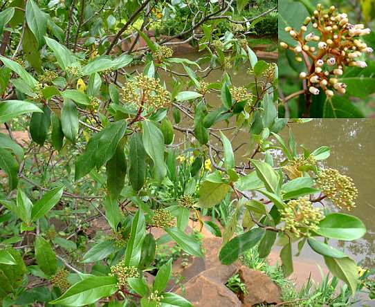 常绿灌木或小乔木,高达3米,小枝具圆形皮孔。叶对生;椭圆形至长椭圆形,长5~15厘米,宽2~7厘米,先端短渐尖,基部阔楔形,全缘或基部以上具疏齿,上面被灰白色蜡质,下面色较浅,脉腋有簇生毛;叶柄长达2.5厘米。聚伞花序5~7,排列成顶生伞房花序,直径可达12厘米;花冠白色,管状钟形,先端5裂,雄蕊5,花药淡紫色,突出;子房下位。核果卵圆形,长4~5毫米,紫黑色或灰黑色。花期3~8月。果期6~11月。