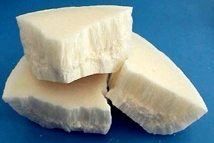 【性状】完整者多为圆形厚块,一般已打碎成不规则块状,大小不一。白色,或微带黄色,不透明或微透明;表面平滑或稍显皱纹,有光泽,触之有滑腻感。体轻,能浮于水面;质硬而稍脆,用手搓捏则粉碎。断面不平正,呈针状结晶形,或显小颗粒状,具玻璃样光泽。有微弱的特异臭气,味淡,嚼之如细沙样。不溶于水、醚及氯仿中,可溶于苯及石油醚中。熔点80~83℃。以色白、质硬、致密而无气泡。无败油气味者为佳。