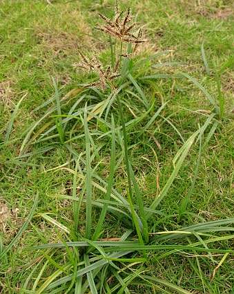 多年生草本,高20~35厘米。根茎细长,常横卧,被褐色残存叶鞘纤维。茎直立,圆柱形,具3~4叶片。叶片扁平,禾叶状,长3~7厘米,宽约0.5厘米,基部成鞘抱茎,全缘,上面绿色,下面淡绿色,叶鞘下部带紫红色。花小,4~11朵结成稠密的伞形花序,基部有3片褐色叶状苞片;花序具不等长的柄而排成不规则的聚伞花序,基部有1片披针状线形的叶状苞片;苞片直立,绿色,下部带紫色,高出整个花序;花被裂片6,褐色或橘褐色,披针形,渐尖;雄蕊比花被片稍短,花药比花丝长;雌蕊伸出花被片,上部3裂,褐红色。蒴果3瓣裂。32.98