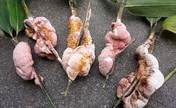 子座肉质,渐变为木栓质,粉红色,呈不规则瘤状,初期平滑,后龟裂,1.5~4x1~2.5厘米;子囊壳近球形,埋生于子座内,直径480~580微米;子囊280~340x22~35微米;孢子单行排列,长方形至梭形,两端大多尖锐,42~92x13~35微米,无色或近无色,成堆时呈柿黄色。