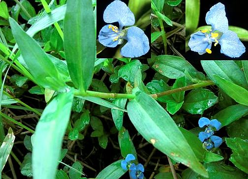 多年生披散草本。茎柔弱,匍匐地面,节上生根,或为半 攀援状。叶披针形或卵形,长3〜7厘米,宽1〜1.5厘米, 先端短尖或渐尖,?净或披柔毛;鞘常有红色小斑点,鞘口 有睫毛。佛焰苞具柄,卵状 披针形,折迭状,长1.5〜2.5厘米,先端短尖或渐 尖,基部浑圆或心形,?净 或被毛,有纵线条,横线条 不明显,柄长1〜3厘米;聚伞花序在1苞内2个,下 部1个有花1〜3朵,不结 实,上部的有花1〜2朵,结实;萼片3;花瓣3,蓝色 或外面1枚淡白色;发育 雄蕊3,退化雄蕊3;子房 3室,其中2室含胚珠2 颗,背室含胚珠1颗。蒴 果。种子黑色,有网纹和深 窝点。花期夏、秋。18.08